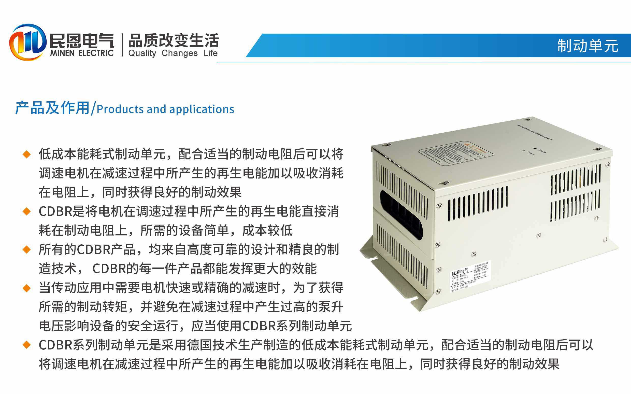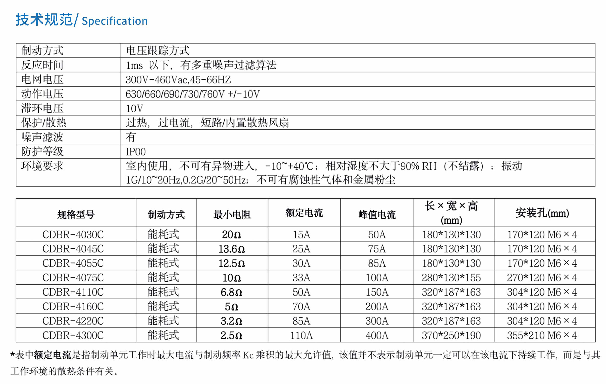 低成本能耗式制動單元,配合適當的制動電阻后可以將調速電機在減速過程中所產生的再生電能加以吸收消耗在電阻上,同時獲得良好的制動效果。 CDBR是將電機在調速過程中所產生的再生電能直接消耗在制動電阻上,所需的設備簡單,成本較低。 所有的CDBR產品,均來自高度可靠的設計和精良的制造技術, CDBR的每一件產品都能發揮更大的效能。
