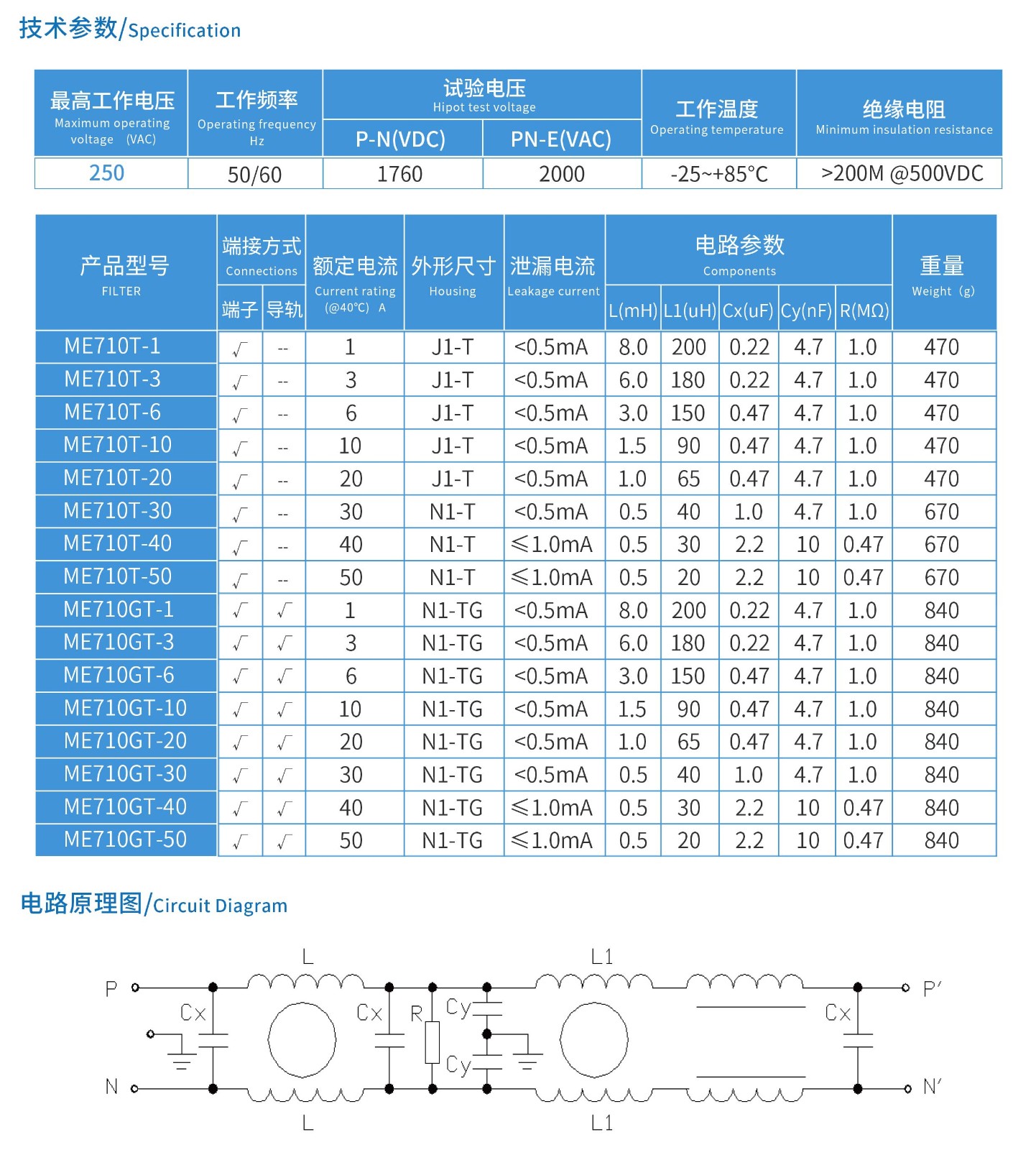 ME710T系列單相三節端子式電源濾波器