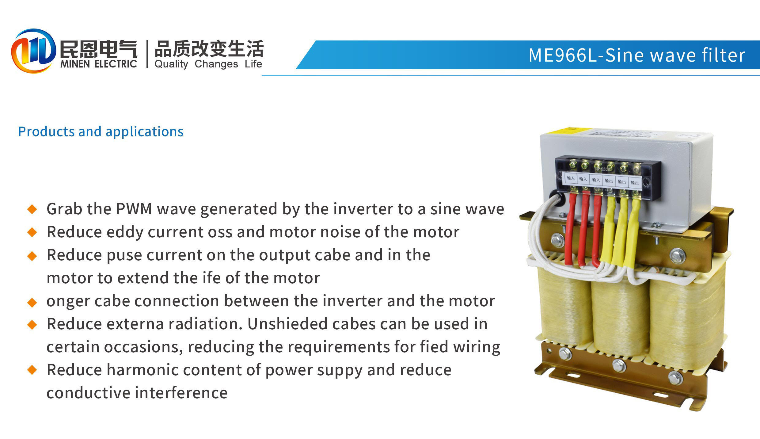 將變頻器產生的PWM波轉換為正弦波,降低電機的渦流損耗以及電機噪聲,減少輸出電纜上和電機中的脈沖電流,延長電機壽命,可在變頻器與電機間使用更長的電纜聯線,減小對外的輻射,在一定場合可以使用非屏蔽電纜降低了對現場布線的要求,降低電源諧波含量,減少傳導性干擾