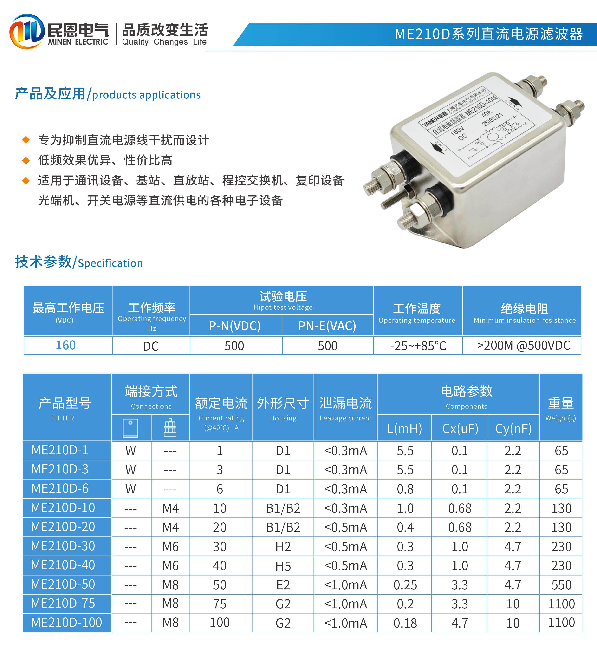 ME210D系列單節(jié)直流電源濾波器